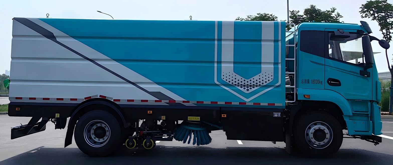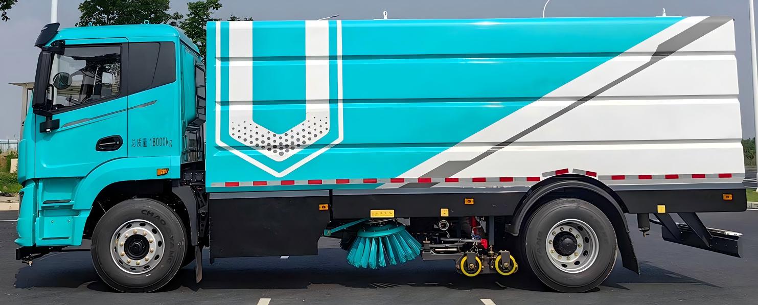 底盤發動機驅動洗掃車向前行走,掃至吸嘴前方的垃圾不斷進入到吸嘴中,并源源不斷地被吸到垃圾箱中,實現路面清掃。