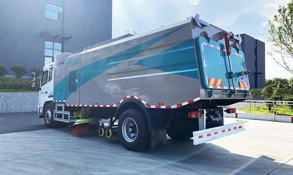 底盤發(fā)動機驅(qū)動洗掃車向前行走,掃至吸嘴前方的垃圾不斷進入到吸嘴中,并源源不斷地被吸到垃圾箱中,實現(xiàn)路面清掃。