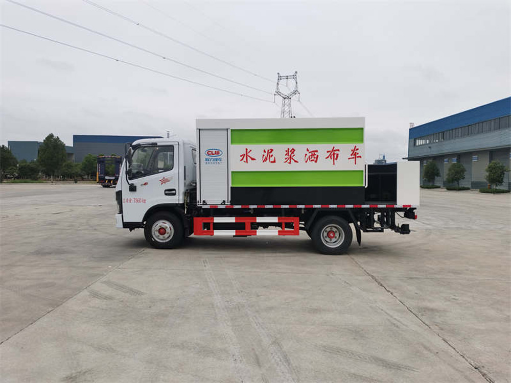 該車特點 水泥罐、清水罐采用 Q235 優質碳鋼制作,高壓水泵,水泥泵(專用),攪拌系統,液壓系統,水罐到攪拌罐供 水系統(渣漿泵),15 米高壓清洗管道(帶卷盤、手持清洗槍),減速分動箱(車輛在行駛工作過程中將車速減慢 從而達到更加理想的灑布效果),尾部 14 個水泥漿專用噴頭,最大灑布寬度 4 米。標配水罐向攪拌罐供水系統,標 配提升裝置(用于袋裝水泥向罐體頂部運輸)。